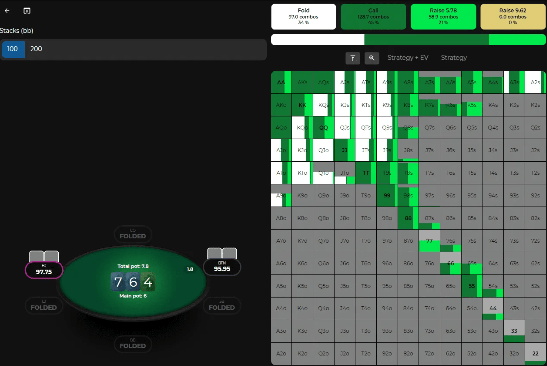 - Ваши блефы приносят больше EV. Обратите внимание, что солвер блефует на этом флопе не только с дровами (например, QJ), но и с полным воздухом и низкими карманками.