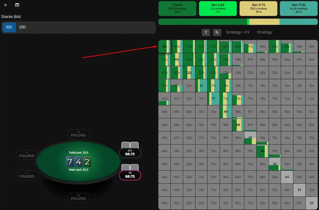 Мы видим, что солвер с АА на таком флопе предпочитает чекать примерно в 70% случаев.
