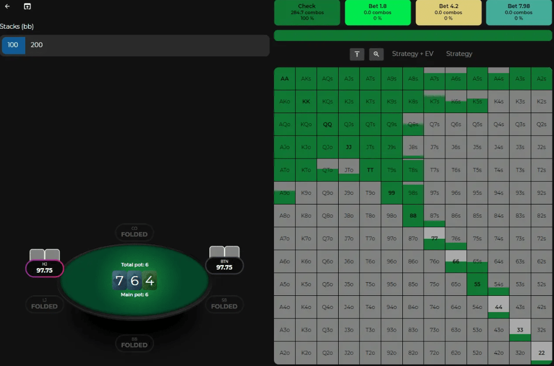 Однако в рейндже оппонента будет гораздо больше доля сетов, двух пар, пар и флеш-дро, чем просто мисснутых оверкарт. И учитывая эти факторы, солвер прибегает к крайней мере — чекает весь свой диапазон в качестве игрока без позиции: