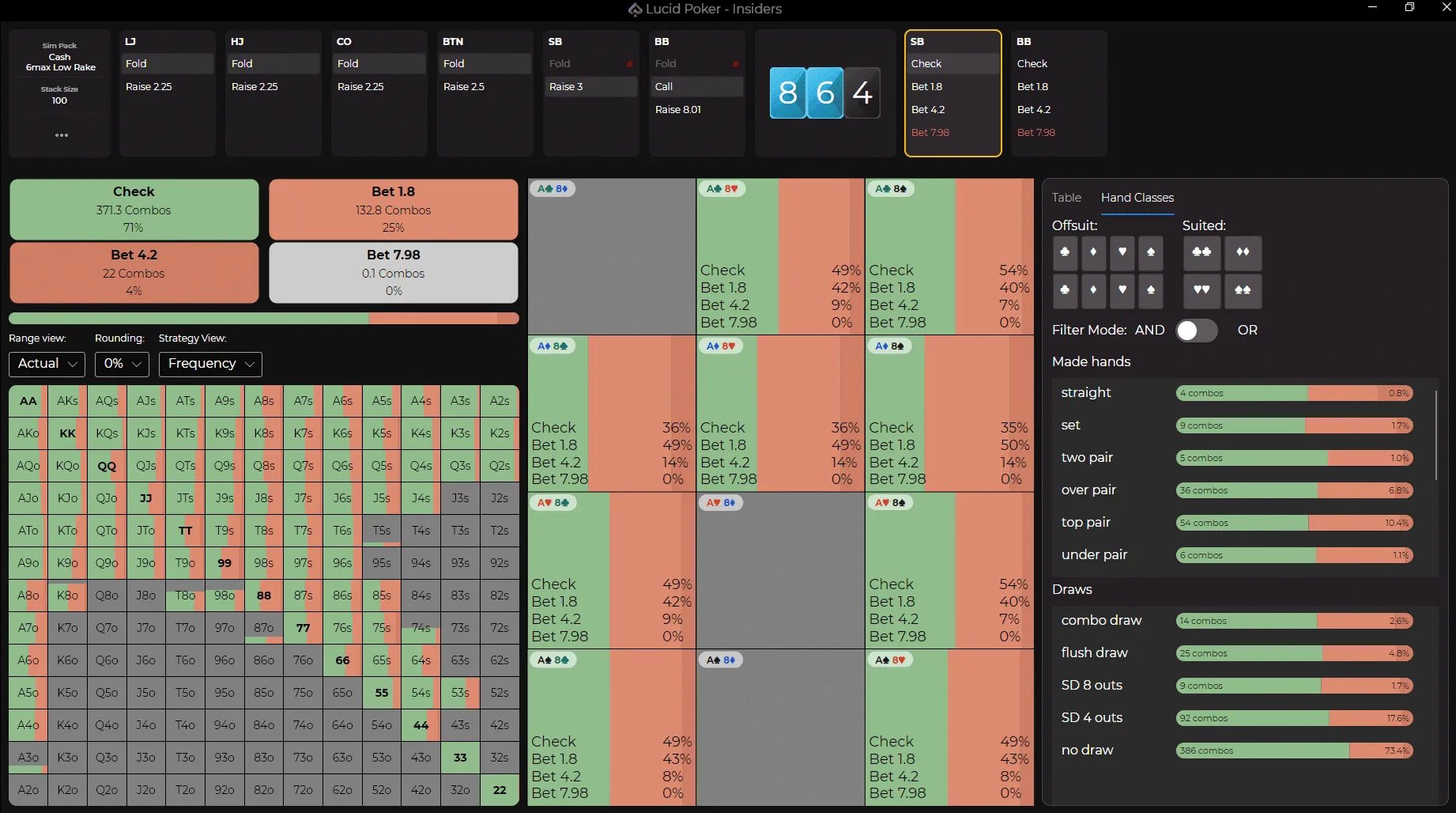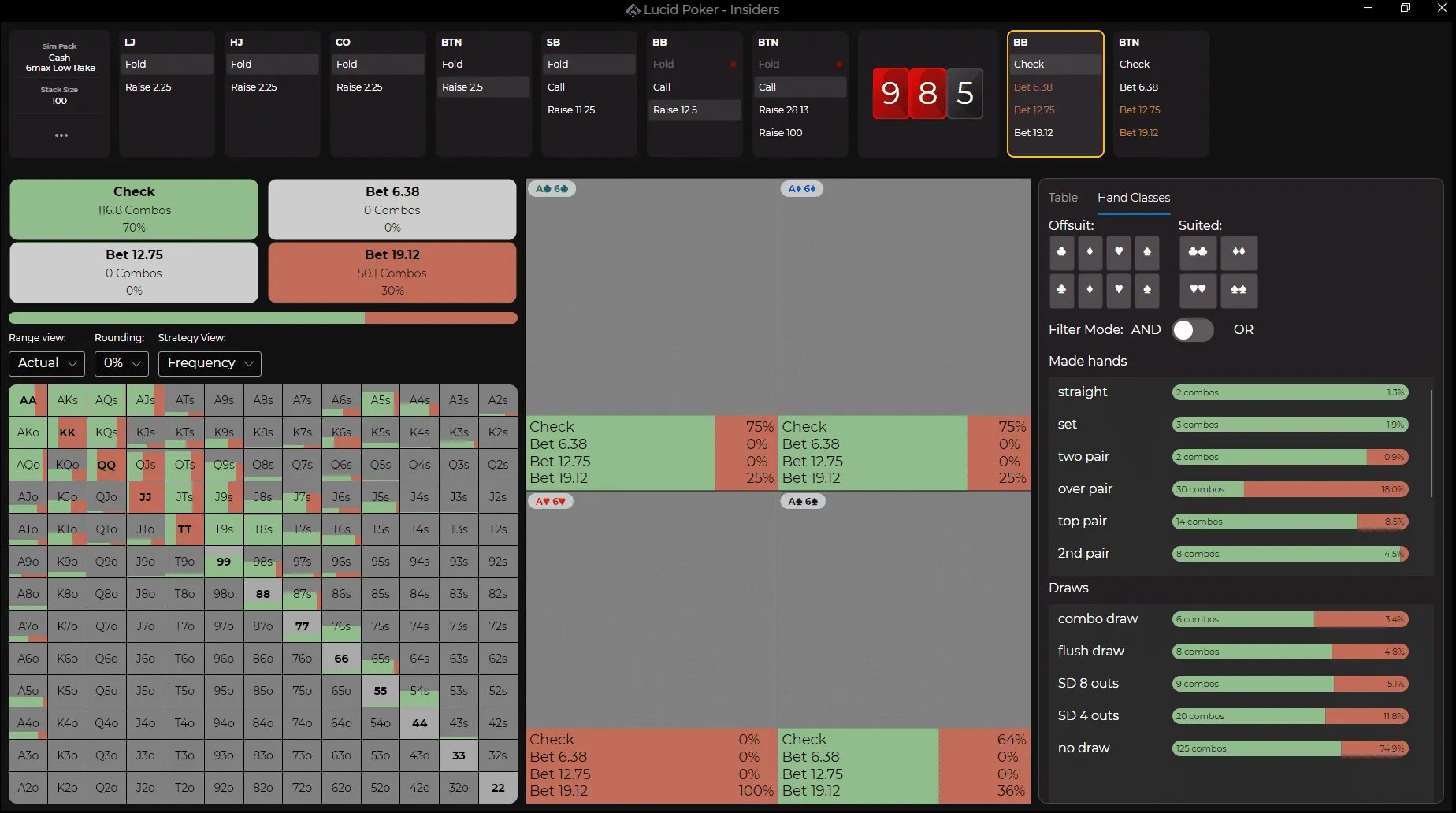 Также мы видим, что «две пары+» почти всегда чекают. AA делает это в большинстве случаев, к ним домешиваются в меньших долях KK и QQ — чтобы BTN не имел достаточно сильных рук для безнаказанного частого проб-бета всего диапазона.