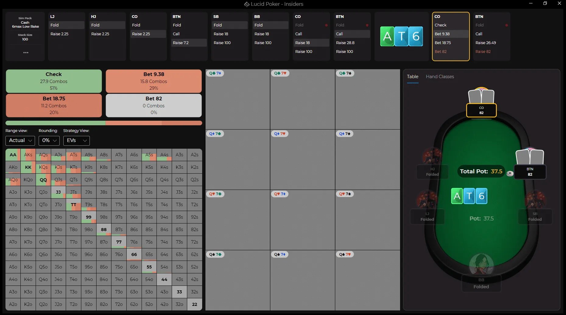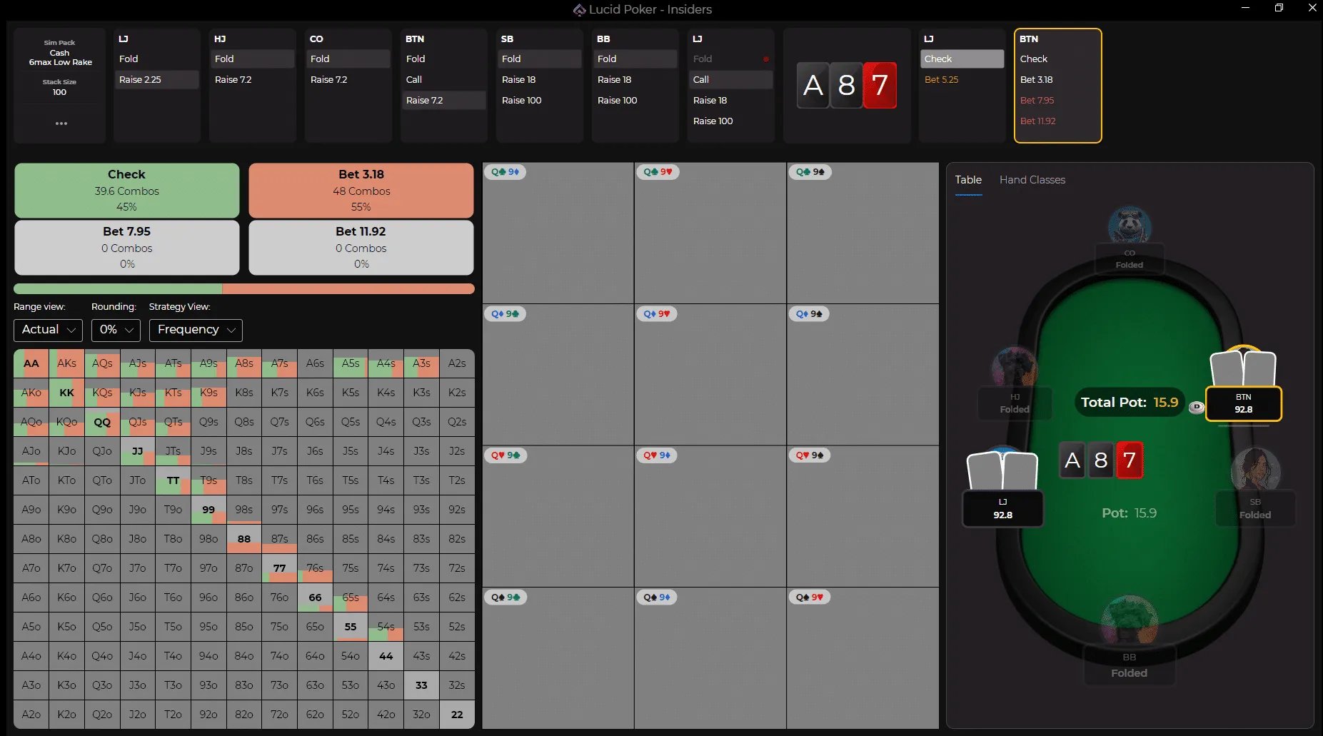 SPR здесь совсем низкий, значит, вы комфортно выставитесь и без раннего раздувания на флопе. Это снижает стимул сразу ставить даже с премиумами AA и TT. Более того, дать оппоненту «натянуть» доминируемый сет (вроде 99 или 88) — разумная (и порой оптимальная) затея даже для ГТО-модели.