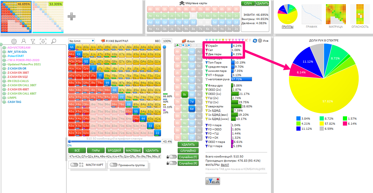 Натсовые руки - в розовой рамке, и их доля не превышает 10% спектра в широких спектрах на типичных средне-низких мокрых досках, которые так часто оказыаются неприятными для префлоп-агрессора.