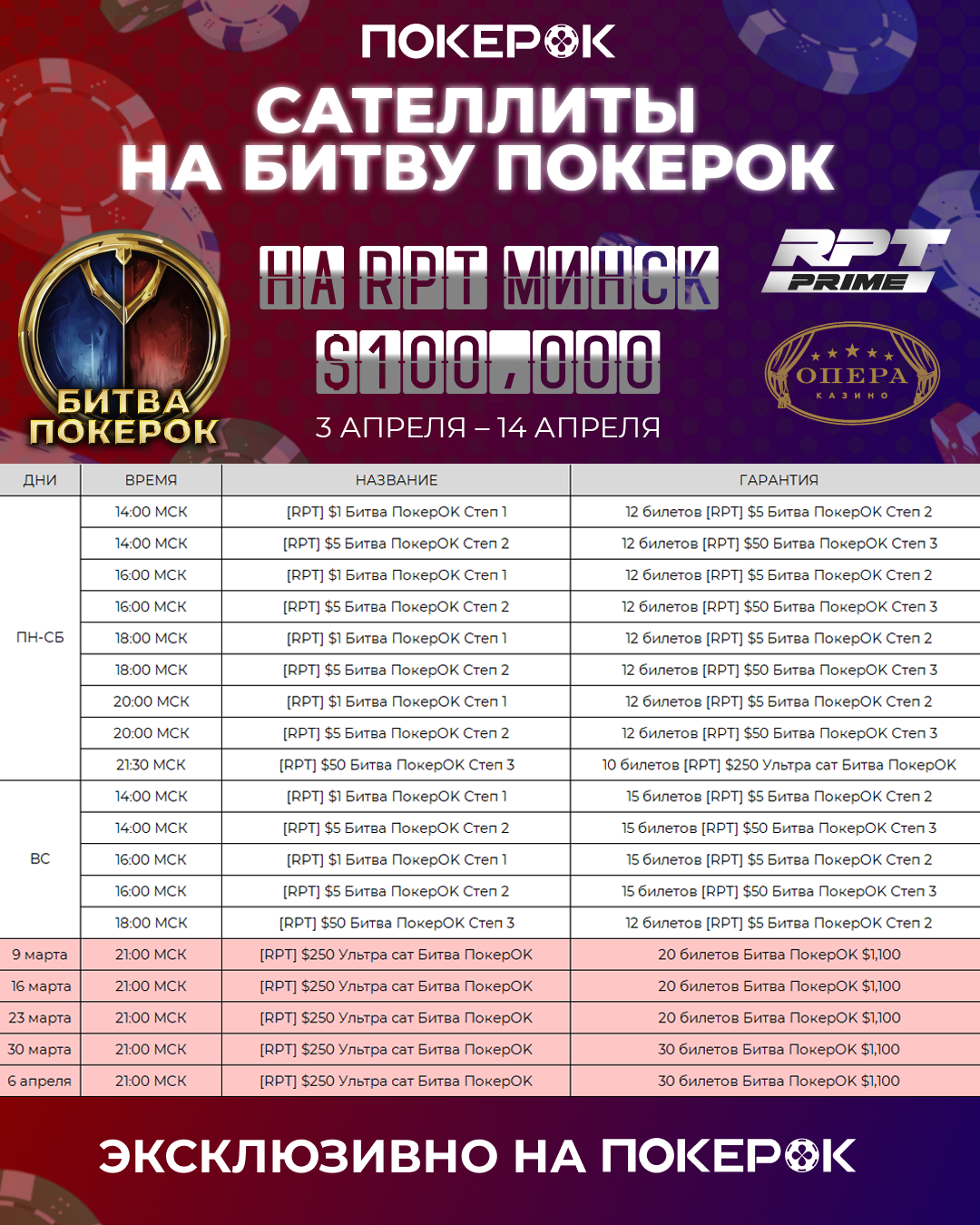Кульминация Битвы ПокерОК состоится 8 апреля в 13:00 МСК. Это ваш шанс попасть в турнир с огромными призовыми, поэтому не упустите возможность пройти отбор через доступные сателлиты и степ-сателлиты на ПокерОК.