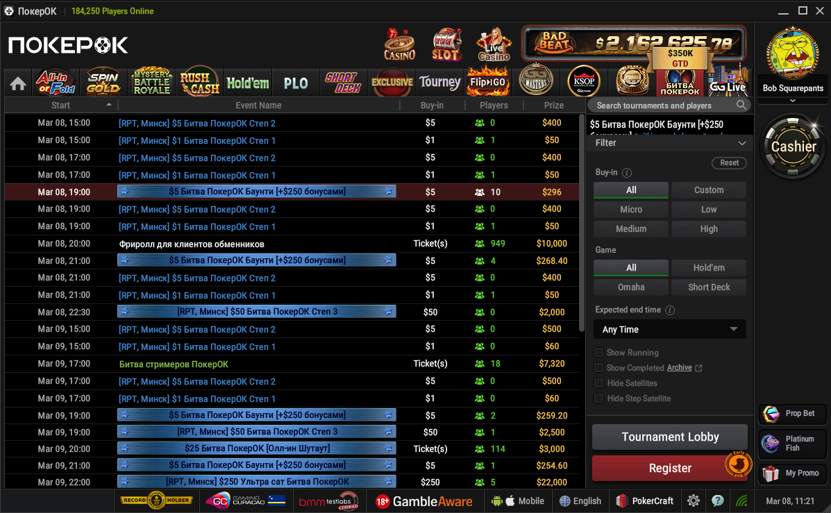 9 марта: 20 билетов Битва ПокерОК $1,100