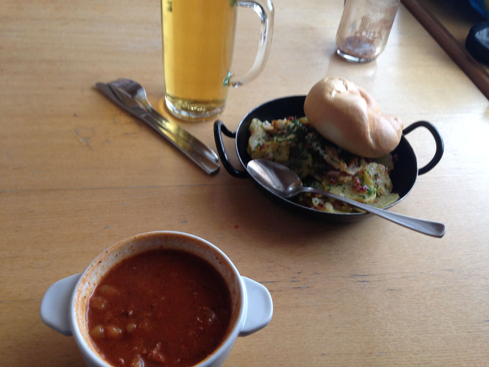 Традиционная еда в горах (во время катания, между спусками стоят кафе, можно остановиться и пообедать). Гуляш суп от 3 до 4 евро , Тироль Гростл (картошка, бекон или ветчина или сосиськи порезанные, яйцо, специи) от 7,5 до 9 евро, пиво около 3 евро.