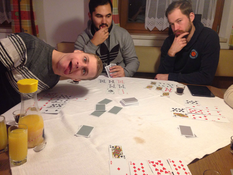 Каждый вечер играли в китайский покер (ананас) на деньги с двумя колодами так как нас было 5 человек, со своими правилами, где можно было собрать по нижней линии 5 одинаковых, типа KKKKK, за что само собой давали фентези и кучу очков вдогонку, собственно, я два раза подряд собрал QQQQQ по нижней линии, было очень ржачно увидеть лица ребят, после такого расклада, а вы ГСЧ в онлайне ругаете :)