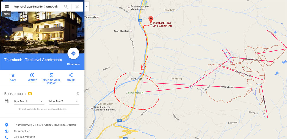 От сюда ближайшее место для катания в 3-ех километрах это Zillertal Arena, добраться можно, как на машине, так и на бесплатном Ski Bus. На Zillertal Arena много трасс, хорошие спуски, в целом все понравилось. До Майрхофена от сюда на машине 12км, по скольку у нас была машина, мы объездили все трассы в данном районе.