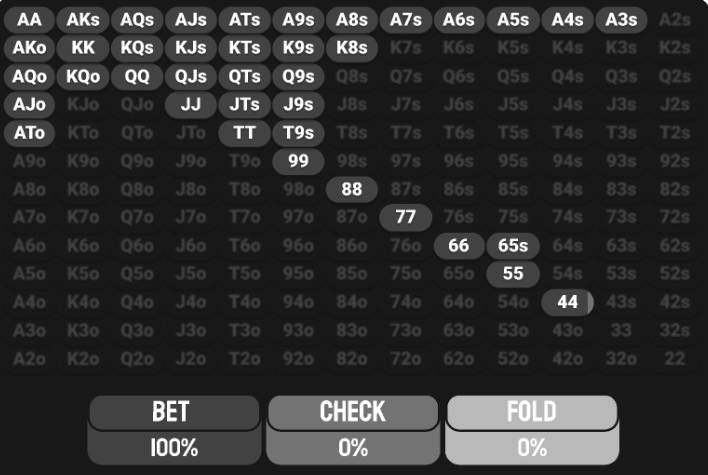Давайте прогоним эту раздачу в солвере еще раз, но теперь зададим SB стратегию — всегда коллировать с 77 и 55, и никогда не чек-рейзить эти руки. Все остальное оставим без изменений.