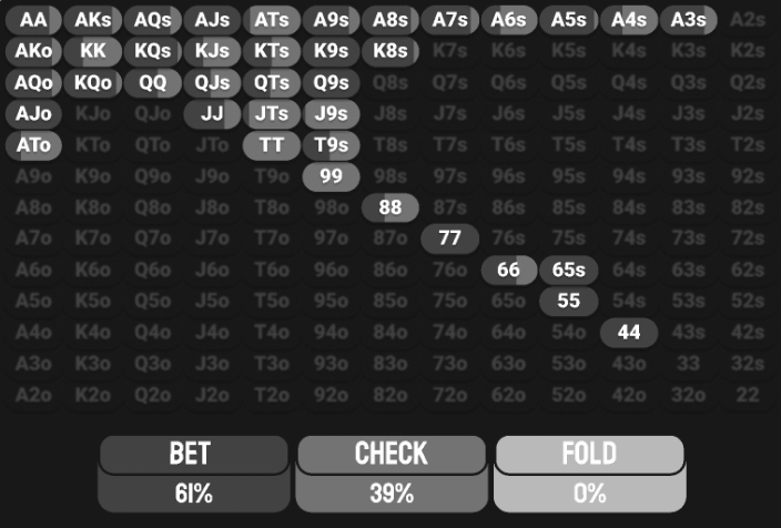 Это, по сути, лучшая карта для UTG, но он теперь играет гораздо более осторожно — чекает в 39% вместо 10%.