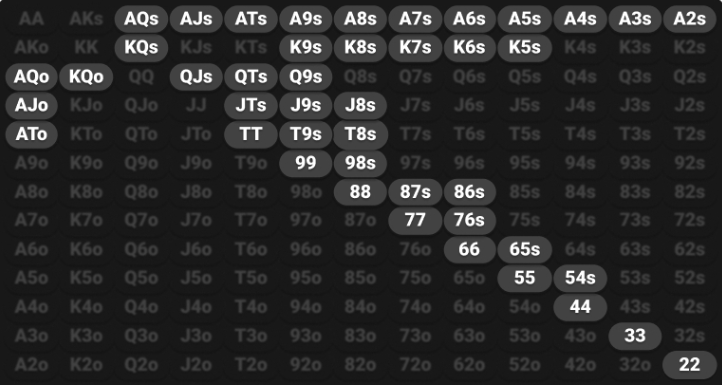 Итак, рассмотрим раздачу. Эффективные стеки — 40 бб, UTG открывается с диапазоном: