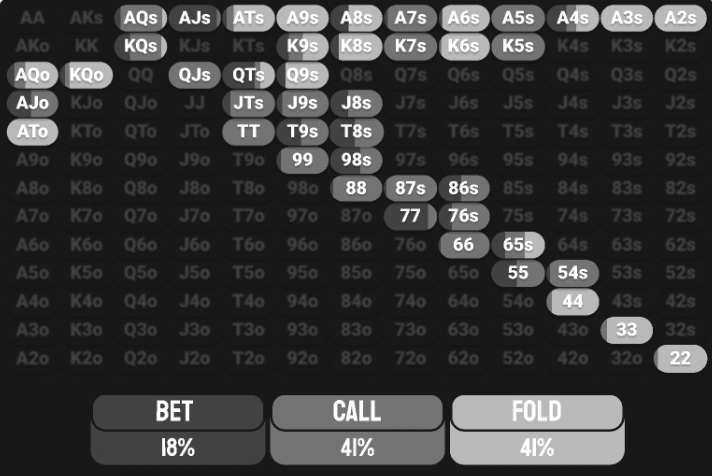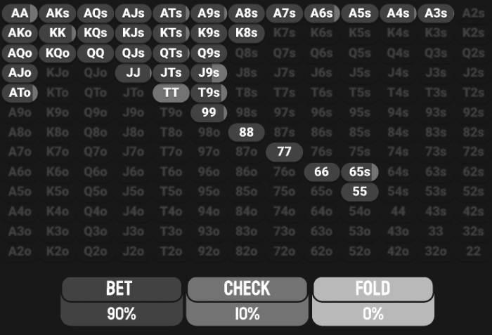 У UTG будет преимущество в диапазоне, ведь его префлоп-диапазон намного сильнее. Поэтому UTG ставит почти со всеми своими руками, используя самый разный бет-сайзинг (малый, средний и крупный). В ответ на самый частый сайзинг (2,7 бб) SB играет так: