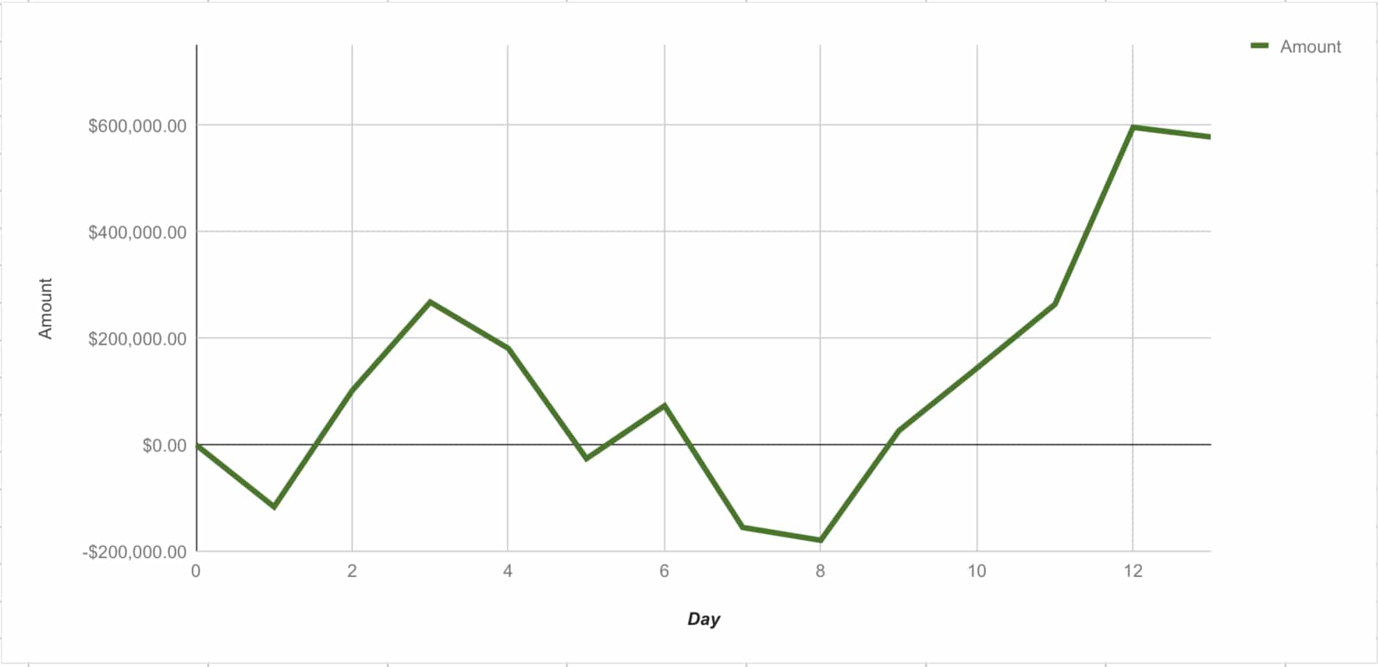 Участники челленджа сыграли 6,227 раздачи — ровно половину от контрольной точки 12,500 раздач, после которой проигрывающий покерист сможет признать своё поражение или же продлить матч до полных 25,000 раздач. Даг Полк впереди на $578,417, ниже график его результатов: