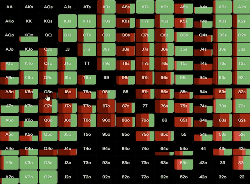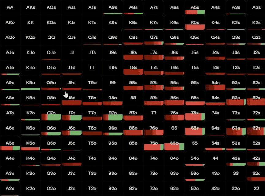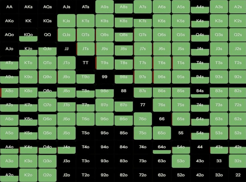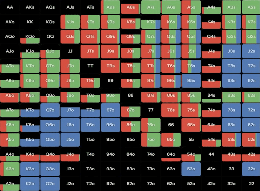 С A7o мы примерно в половине случаев коллируем и в половине случаев — чек-рейзим до 9,2 ББ. Также у нас есть немного блефов, но многие игроки отказываются от них, делая себя более лёгкими соперниками, поскольку они ререйзят только с лучшими руками. Кроме того, в глубине 40 ББ мы можем пушить мелкие и средние карманные пары, а также AK, A2.