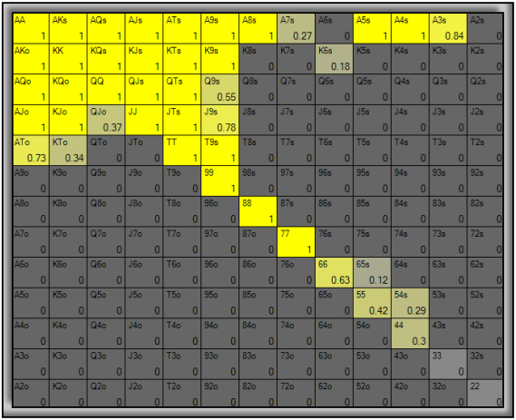 На самом деле, мы можем спросить у PIO, что бы он делал на месте BU, если бы SB недоблефовывал. Для этого мы вручную уберем из его диапазона бета руки 44 и 88. Итак, давайте проверим нашу предыдущую теорию о том, что все наши чистые блеф-кетчеры должны зарывать против андер-блефового диапазона.