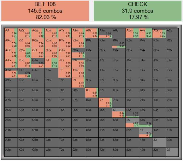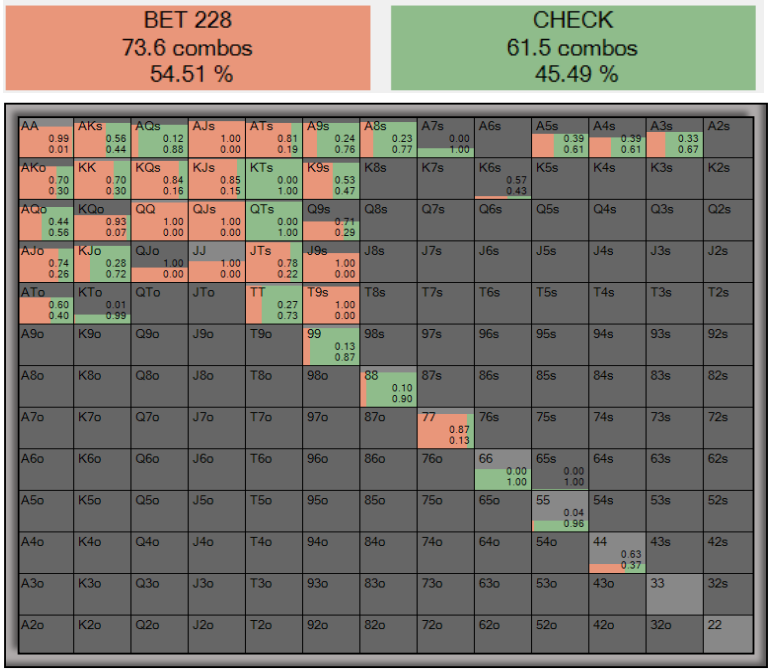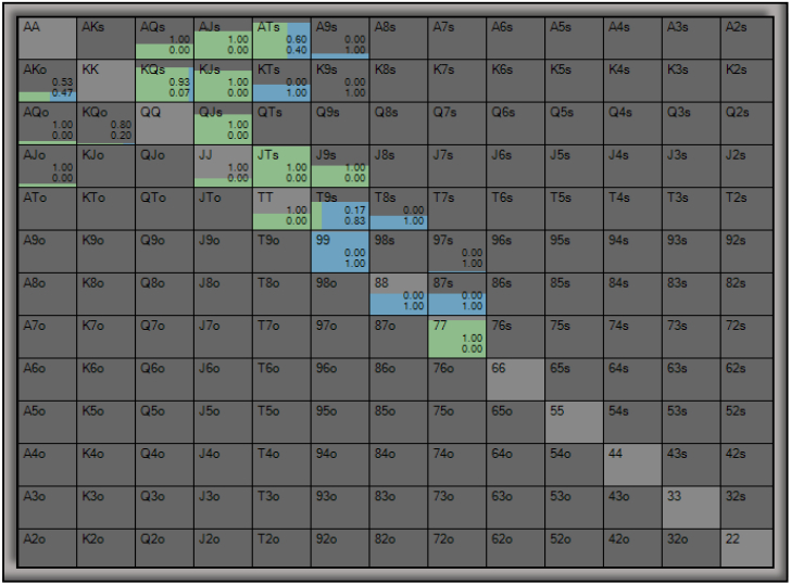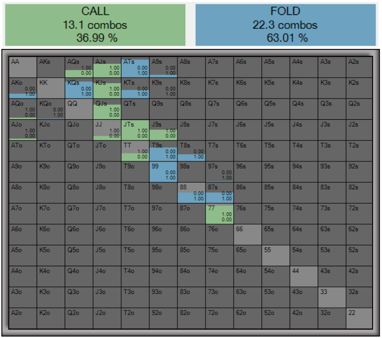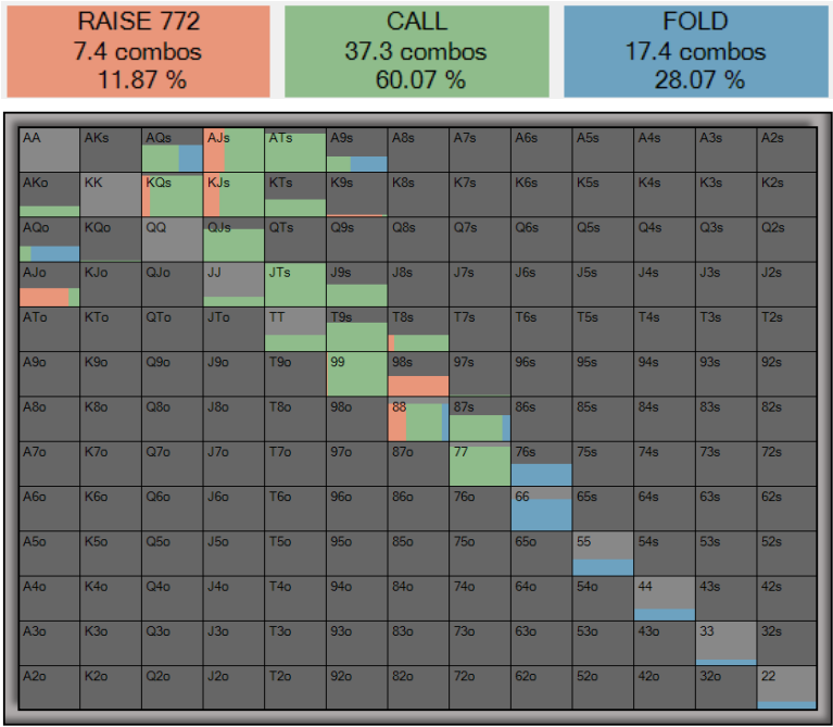 Ниже мы увидим, что самая сильная рука, с которой SB блефует здесь, — это 88. Таким образом, в качестве игрока на BU мы даже не рассматриваем блеф-кетч с 88, а вот все руки лучше 88 (начиная с 99) уже коллируются с некоторой частотой.