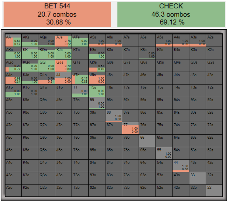 - Наблюдение 1: Многие из сильных велью-рук SB прочекиваются с приличной частотой. Мы не можем с точностью до процента сказать, как именно поле будет играть эти руки, но мы можем почти с уверенностью сказать, что поле будет проставлять такие руки, как KJ, AQ, TT и Q9, гораздо чаще, чем солвер.