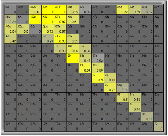 Позже мы увидим, что самая слабая велью-рука оппонента на SB, согласно PIO, — это AA (он не в 100% с ней ставит, но иногда это делает), а второй самый слабый велью-бет — это J9. Так вот, согласно нашему Правилу #1, вы увидите, что BU будет коллировать все руки лучше AA — в 100% случаев без исключения!