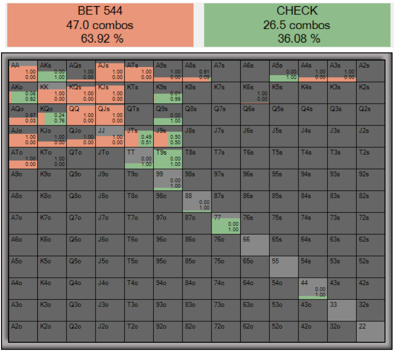 Давайте посмотрим, как изменится стратегия баррелинга SB на бланковом ривере – . Теперь у SB есть много рук, достаточно сильных, чтобы ставить на велью, и поэтому он будет ставить гораздо чаще, идя в олл-ин в 64% случаев.
