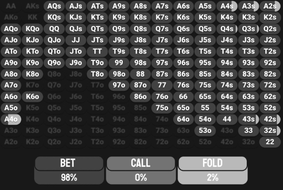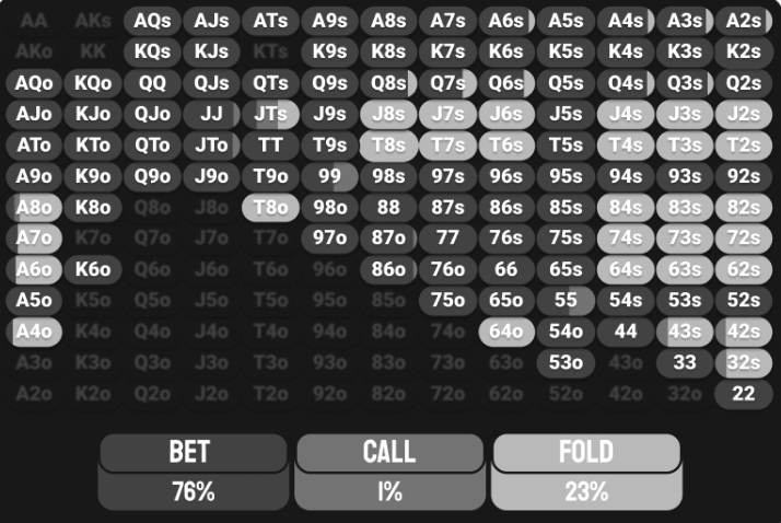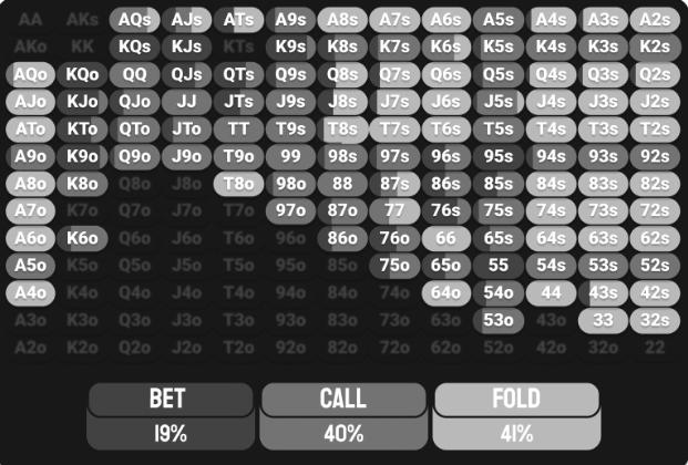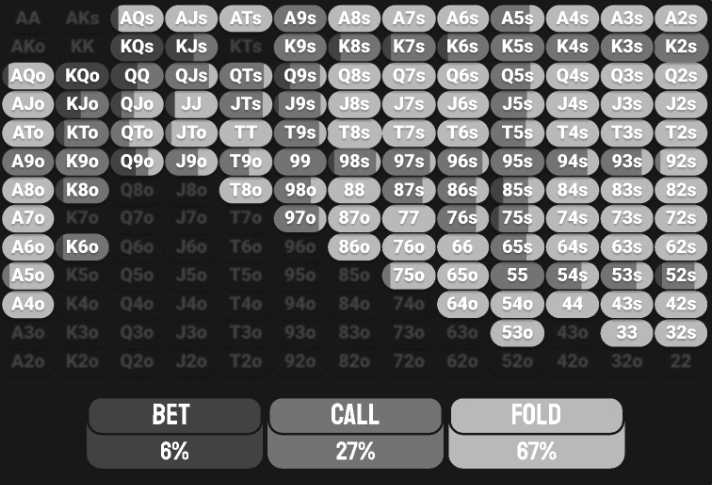 Мы зафиксировали стратегию UTG так, что с ТПТК+ он овербетит; с руками средней силы, вроде 66 или KTo, ставит средним сайзингом; с блефами — выбирает мелкий сайзинг. Это очень «прямолинейный» стиль игры, который мы часто увидим у новичков.