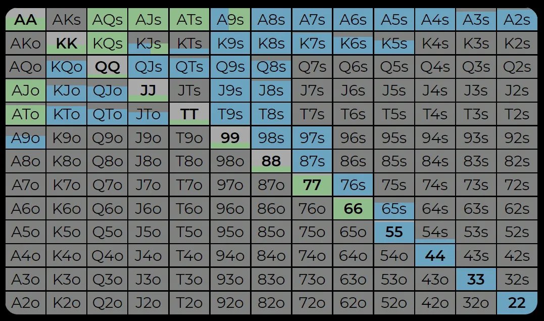 В первом случае в стек пойдут 77, ATs, KQs и AJo. Во втором — мы не будем коллить ничего слабее 88 или AJ.