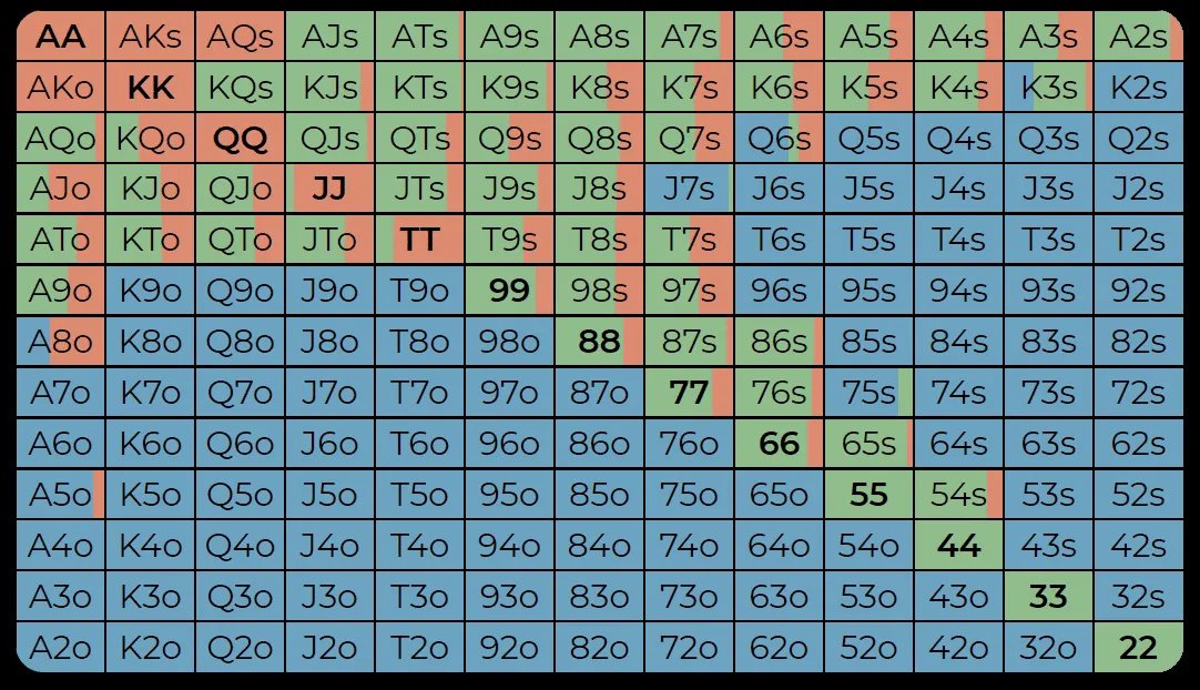 На любом борде вы хотите иметь хоть какое-то «попадание». Есть оговорки (о них ниже), но сперва взгляните на префлоп-чарт: