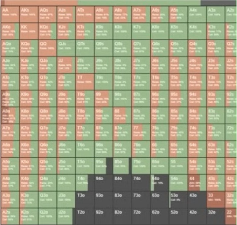 Тёмно-красный цвет — пуш, светло-красный — рейз, зелёный — колл, серый — фолд