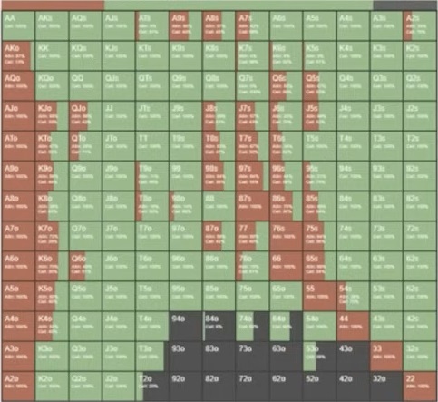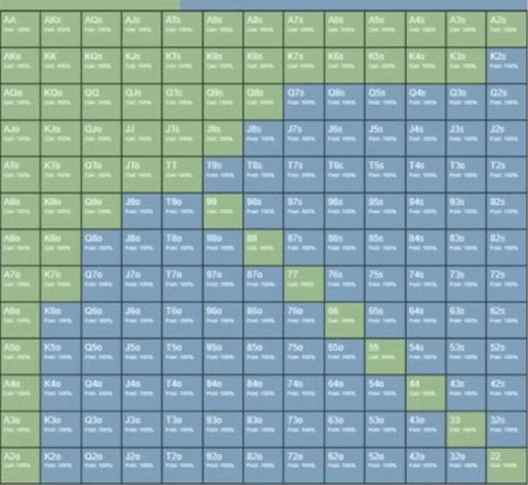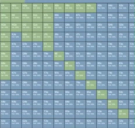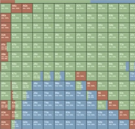 Это имеет смысл, потому что диапазон опен-пуша у МБ с увеличением глубины стека очень сильно сужается. Заметьте, что все руки из нашего диапазона колла стоят очень хорошо против диапазона пуша МБ. Однако в турнире, когда начинают влиять пейджампы, стоит отказаться от коллов с нижней частью нашего диапазона.