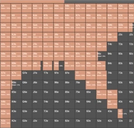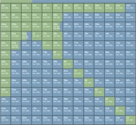 Вы можете удивиться, почему мы открываемся с карманными 33 только в половине случаев, а 22 выкидываем. Дело в том, что эти руки совсем не блокируют диапазон пуша оппонента. Кроме того, мы часто будем получать колл от большого блайнда, и на постфлопе эти пары превращаются в мусорные руки, при этом у нас нет достаточных потенциальных шансов, чтобы пытаться собрать сет.