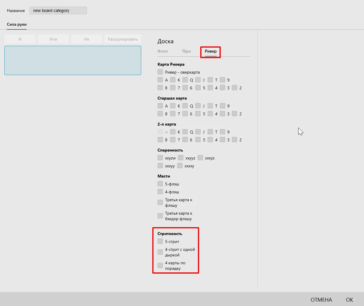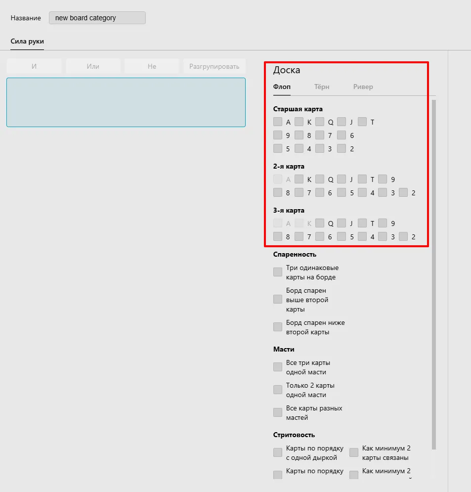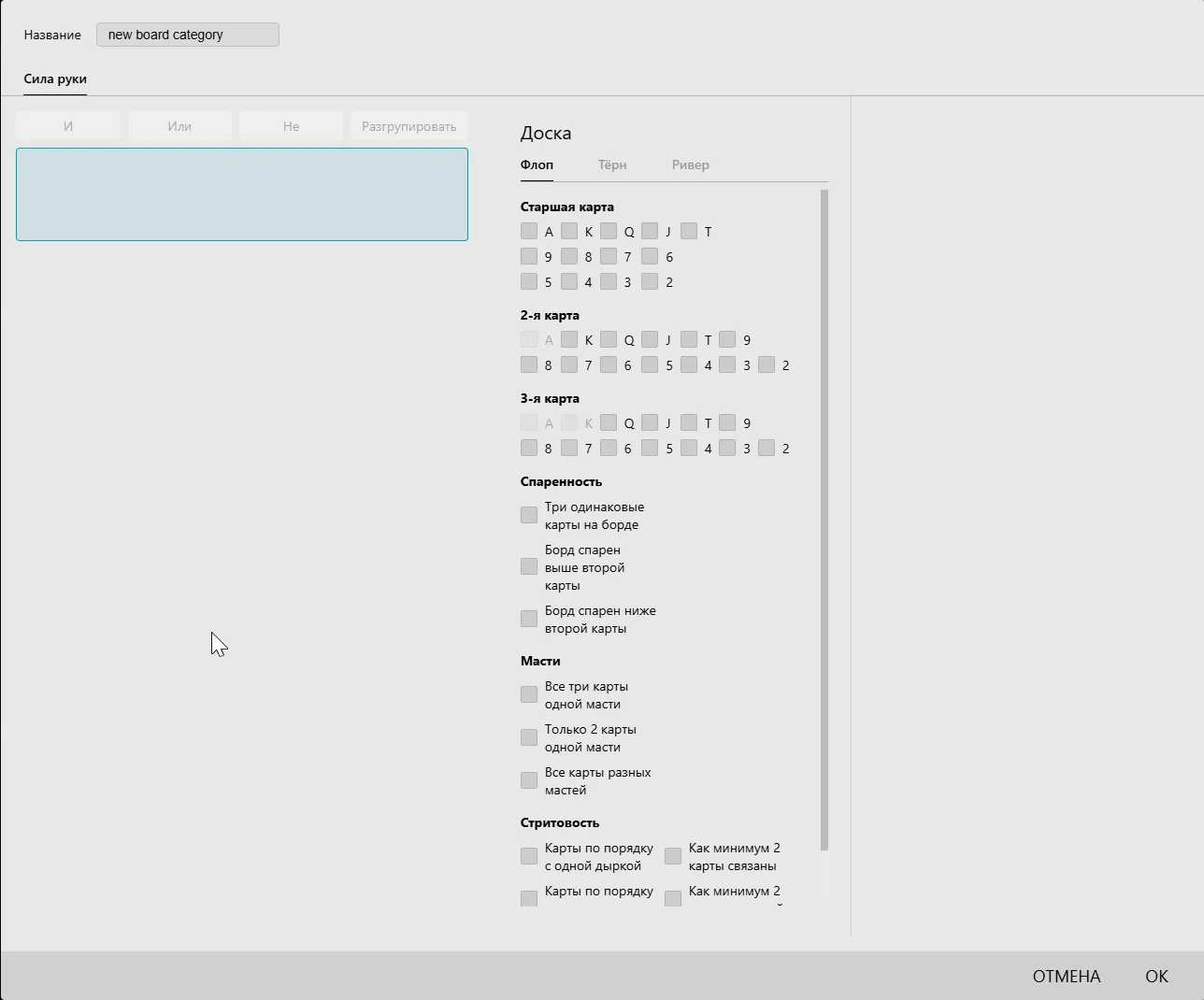 - Нажмите кнопку тест тут и посмотрите, какие руки попадают в вашу категорию. Если все верно, просто повторите в точности в разделе постфлоп;