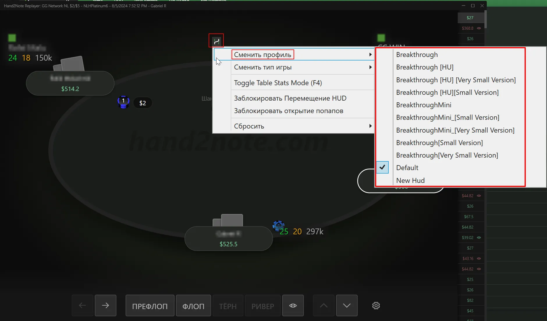 Теперь, чтобы выбрать HUD для нужного типа игр, нужно открывать повтор стола или открывать нужный стол в руме и с помощью логотипа H2N менять профиль.