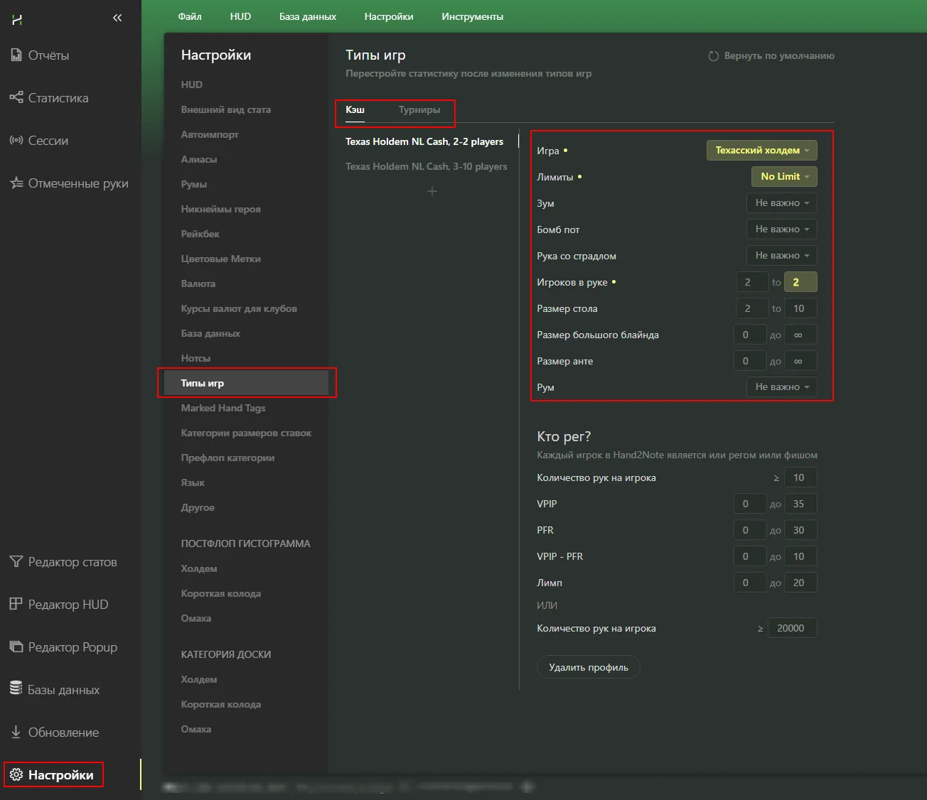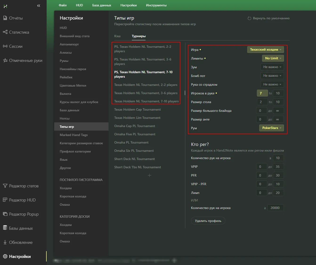 И благодаря типам игр вы можете отделить размер стола на 3-6 и 7-9 человек или отделить и по размеру стола и по наличию анте и для каждого установить свой активный профиль (попап) и потом иметь возможность быстро и легко фильтровать и руки в базе и смотреть свои/чужие статы для разных видов игры.