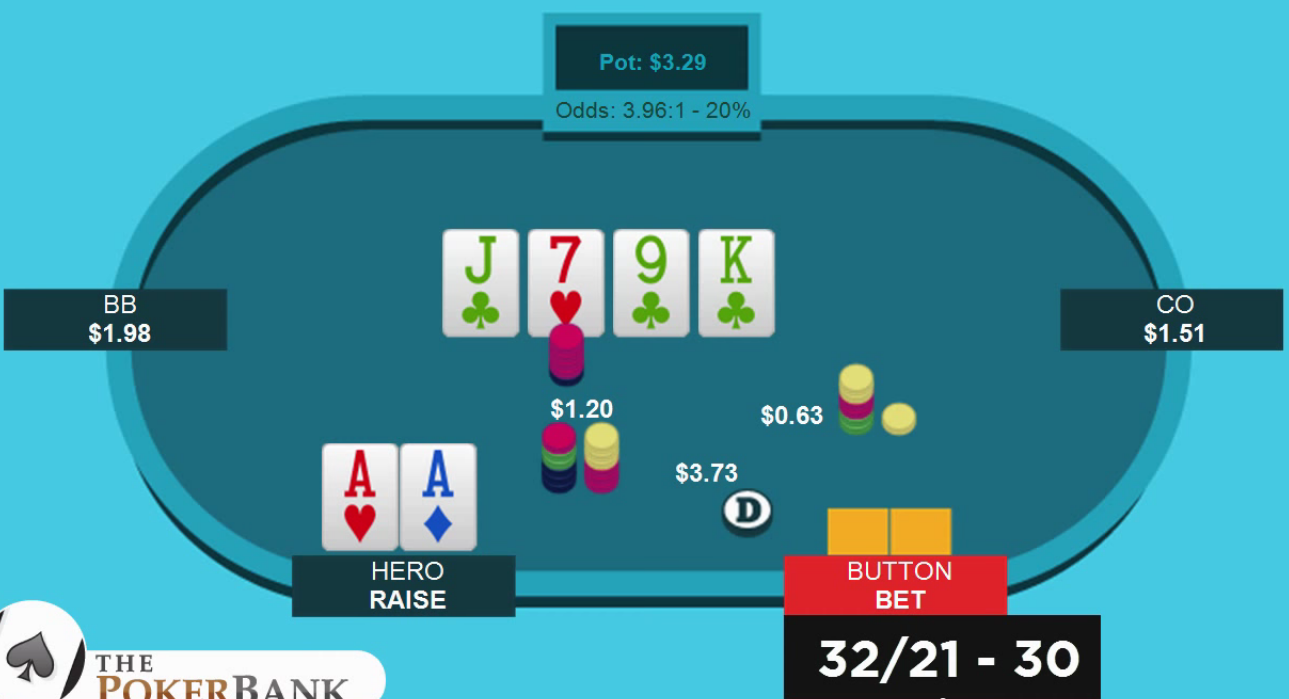 Рука была сыграна на 2NL в онлайне за коротким столом. Игрок на СО открывается лимпом. Затем идет рейз от игрока на баттоне со статами 32/21 на 30 рук. Наш хиро решает сыграть 3-бетом с АА, что меня определенно радует. Однако я все же считаю, что с сайзингом у него здесь основная проблема.
