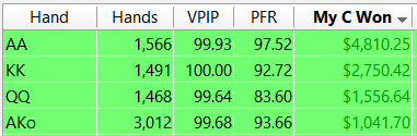 И просто для того чтобы доказать вам, почему вэлью-беттинг настолько важная тема, посмотрите на наиболее прибыльные руки в вашей базе данных. Топ самых выигрывающих рук на достаточно большой выборке будут занимать руки AA, KK, AK и QQ – это руки которые, как правило, 3-бетят на префлопе и вэльюбетят на постфлопе. Поэтому, улучшая ваши навыки вэлью бетов, вы будете улучшать свой винрейт не только с этими премиумными руками, но и с более сложными, такими как AT, KJ и 99.