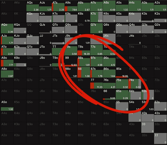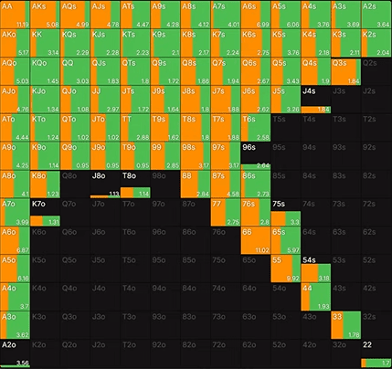 Оппонент снова прочекал, и здесь я использую смешанную стратегию. Я использовал чуть более крупный сайзинг, чем предпочитает солвер, и поставил 3,9 ББ в банк 5,5 ББ (70% банка). И здесь всё стало интереснее, поскольку большой блайнд сыграл чек-рейз до 15,6 ББ. Это хороший рейз, хотя сайзинг для его поляризованного диапазона мог быть и побольше. Но в этом споте большинство игроков низких и средних лимитов допускают ошибку. У большого блайнда здесь много рук вроде 86s, 75s или 87s, и он запросто может с ними переблефовывать, тогда как солвер чек-рейзит с этими руками очень редко, в основном играя коллом: