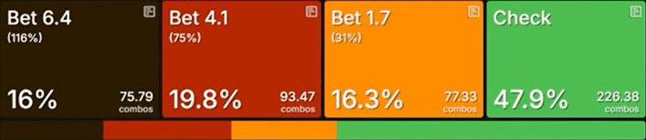 Тёрн — хорошая карта для нашего диапазона, так как у нас есть много Ax. На месте большого блайнда я бы в большинстве случаев ставил овербет 100–150% банка. Ему нужно ставить полярно, поскольку у него есть больше стритов и двух пар, но меньше топ-пар (иными словами, у ББ есть натсовое преимущество, но нет перевеса по диапазону). Со слабыми тузами вроде A4 лучше не ставить.