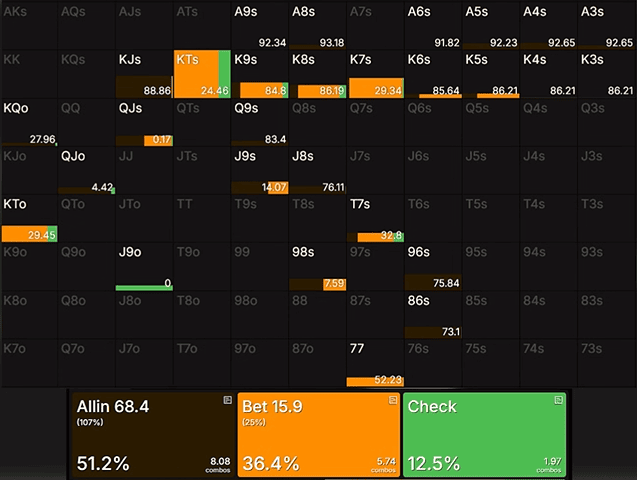 Тёрном пришла . Мы чек, оппонент ставит 25% (19 ББ в банк 78 ББ). С точки зрения GTO, здесь игрок в позиции должен ставить чуть более крупным сайзингом 35–40%, поскольку ставка размером 25% даёт оппоненту (то есть нам) слишком хорошие шансы банка: