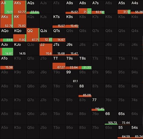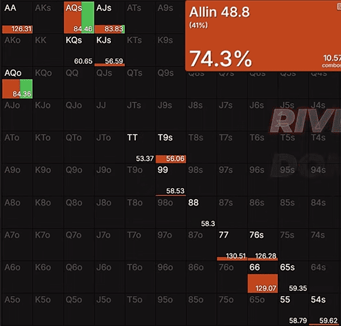 Наш пуш на ривере включает в себя много блефов: 76, 75, 87, 85, и мы запросто можем переблефовывать. Вот почему я считаю, что с сильной рукой мы тоже должны пушить. Оппонент ненадолго задумался и заколлировал, показав на вскрытии . В теории это хороший колл, если вы его миксуете, но не думаю, что противник в этом споте миксовал — здесь он в большинстве случаев будет уравнивать с Ax, поэтому я не буду часто блефовать. Мой вэлью-диапазон здесь достаточно узкий.