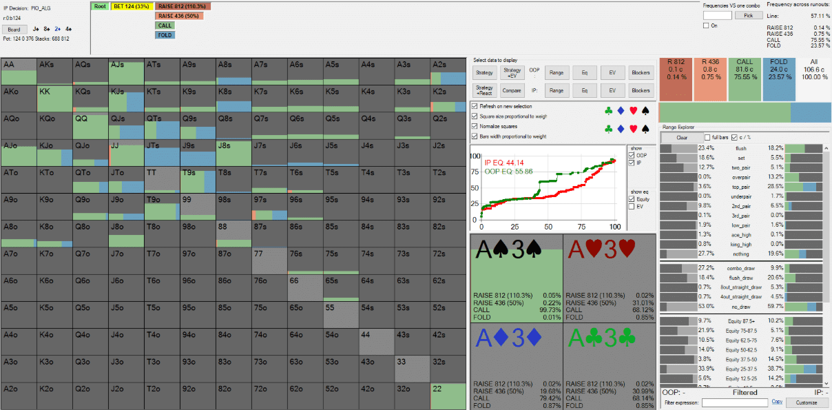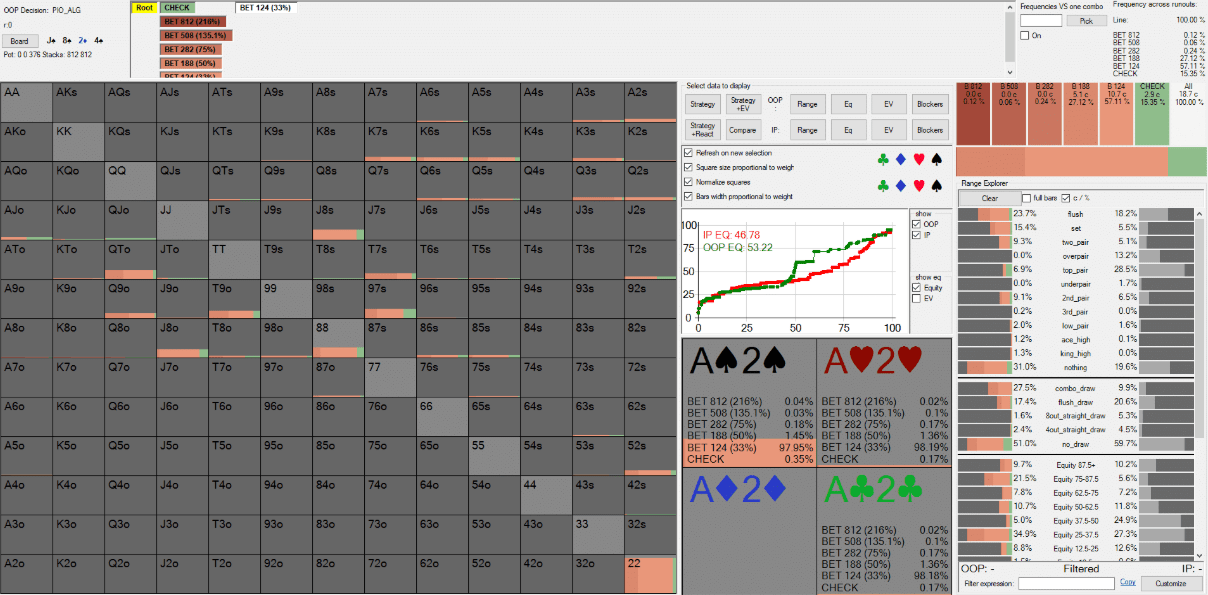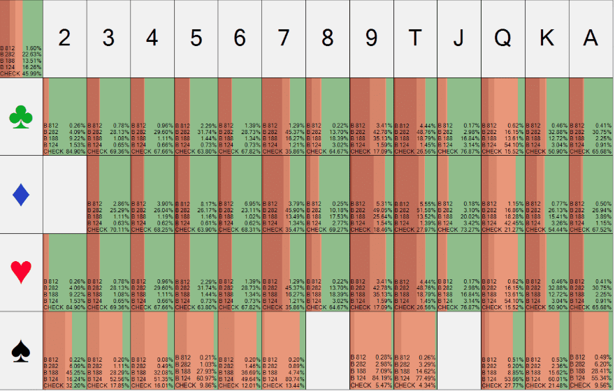 Мы видим, что солвер почти всегда ставит 33% банка с , и делает то же самое со всеми комбинациями J8s.