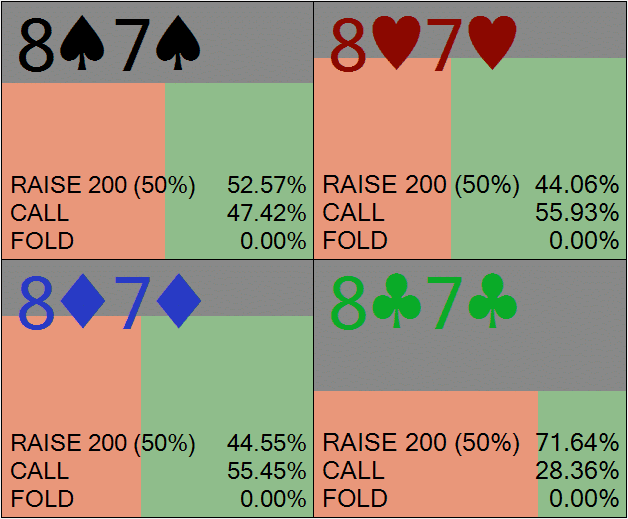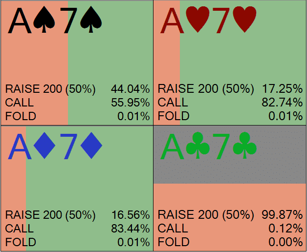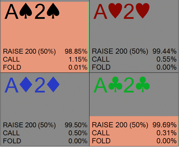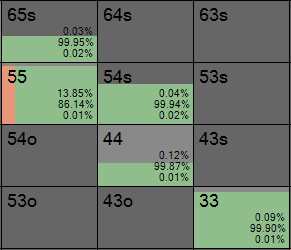 Солвер выбирает чек-колл с 42,26% диапазона и чек-рейз с оставшимися 13,55%.