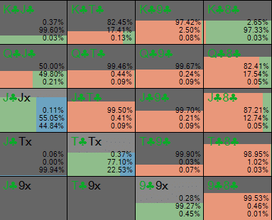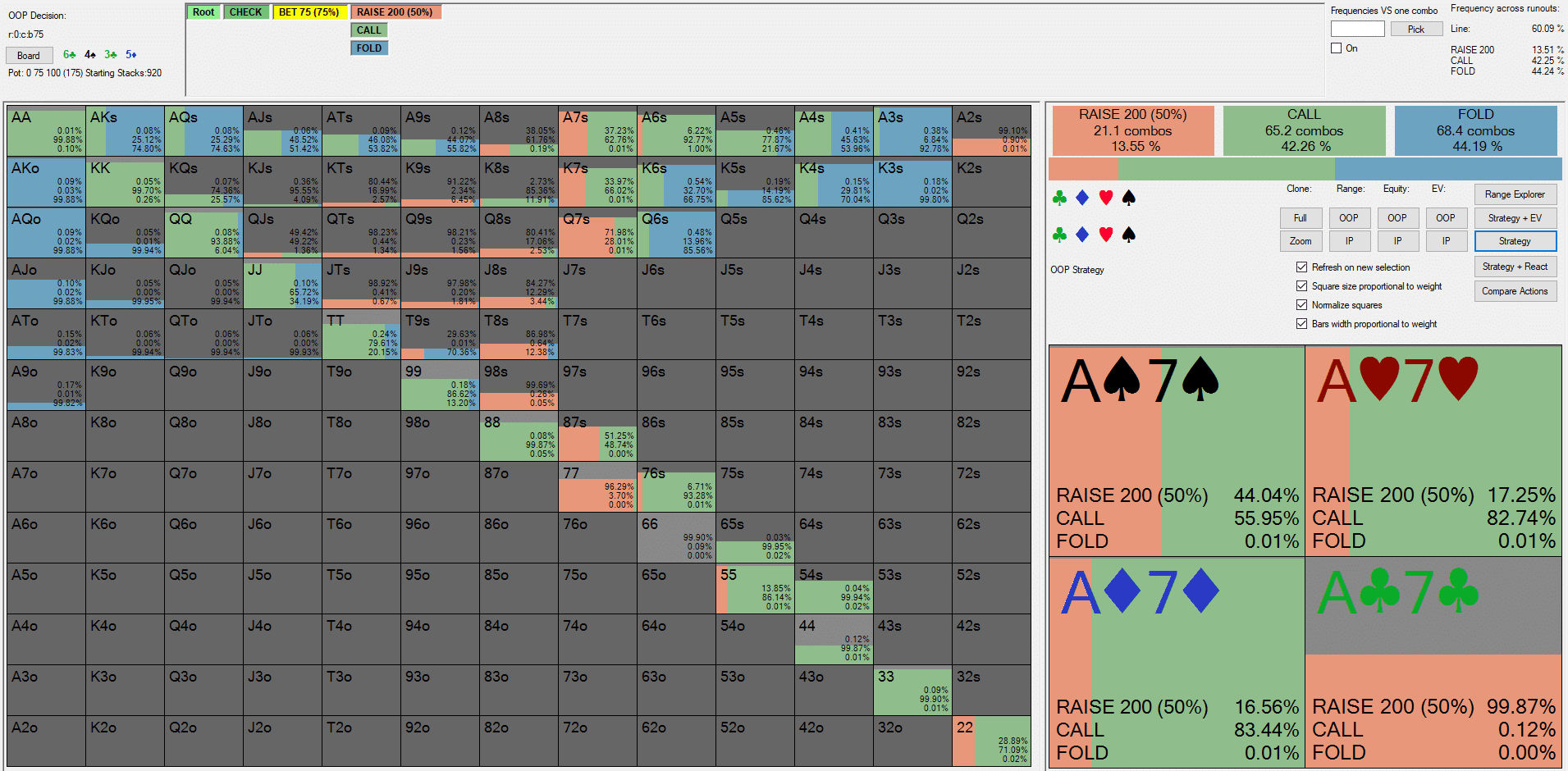 В правом верхнем углу видно, что солвер выбирает чек-фолд в 44,19% случаев (синий прямоугольник). С учетом того, что BTN ставит 75% пота, такая частота фолда подводит нас очень близко к минимальной частоте защиты (МЧЗ) — примерно 43%.