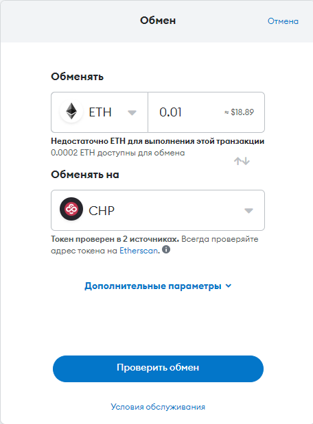В строке «Обменять» вписываем сумму для обмена, а в строке «Обменять на» вписываем название требуемого токена CHP.