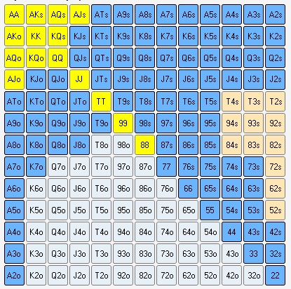 Тем не менее они все еще остаются огромными относительно того, с чем играют регуляры. Если у среднего рега диапазон колла на пре-флопе зачастую не будет превышать 10%, то у автоответчика он будет наоборот начинаться с 30-35%. Средний пример такого диапазона вы можете увидеть ниже: