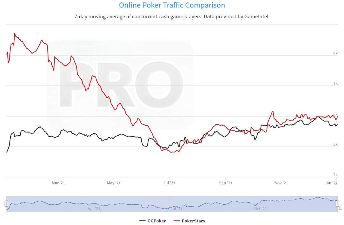 Компания Flutter после покупки PokerStars в 2020 году пообещала увеличить инвестиции в рум и ввести более щедрую программу вознаграждения, чтобы повысить лояльность игроков. Совпадение или нет, но такой разворот в политике PokerStars пришёлся именно на лето 2021 года, когда их догнал GG: в мае Старзы запустили лидерборды для избранных кэш-игроков, в июле начали тестировать новую программу вознаграждения с рейкбеком 65%, а с октября распространили её почти на все страны и резервации. В результате трафик рума снова пошёл вверх. В начале 2022 года у обеих комнат он составляет около 6,000 игроков одновременно.