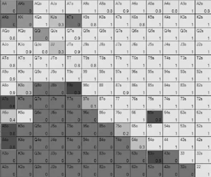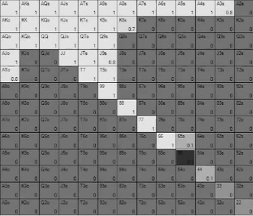 Вы можете смотреть, какие руки ставятся, а какие чекаются, по цветам на матрице. Например, здесь JJ чаще чекают, а AKo чаще ставят.