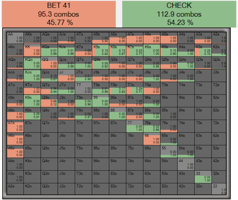 BU же на флопе против этого конт-бета получает возможность избавиться от худших рук в своем диапазоне. Он фолдит в 23% случаев, что немного увеличивает эквити его диапазона с 44% до 48%.