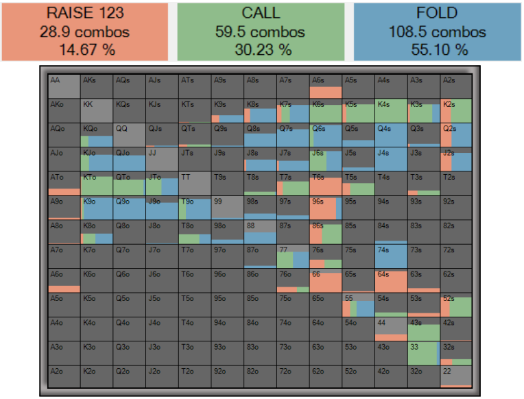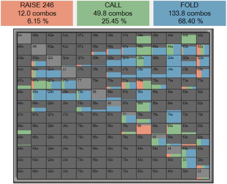 Давайте посмотрим, как BB должен будет реагировать на ставку BU в 75% пота (помните, что по МЧЗ BB должен фолдить всего 43% рейнджа).