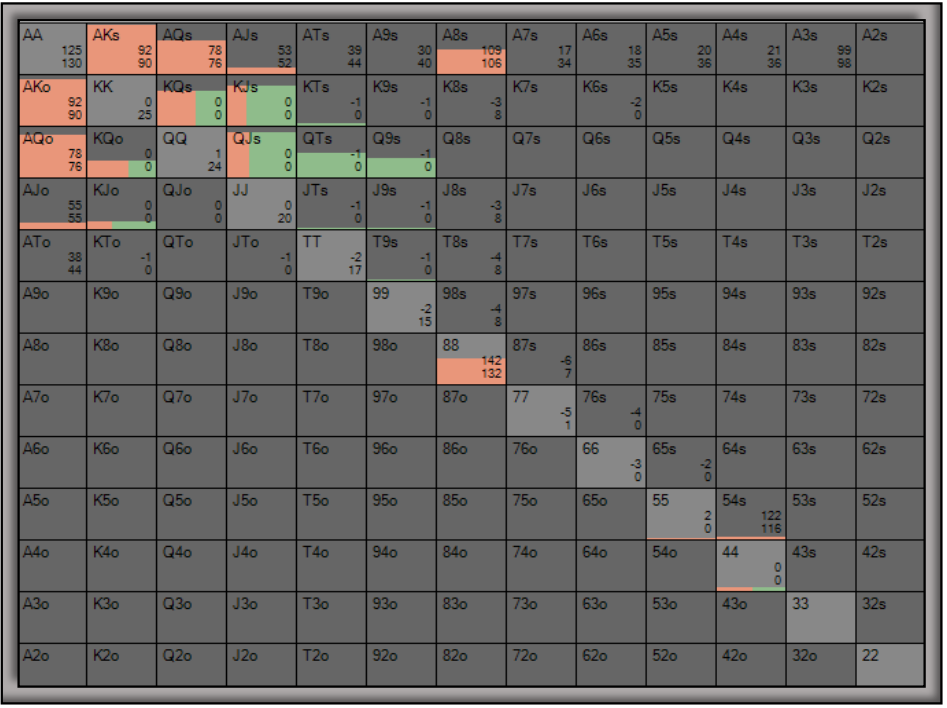 Что ж, это практически всё, что у меня было по этой теме, но прежде чем закругляться, давайте вернемся к той сумасшедшей раздаче из первой части, где мы видели, как SB фолдил на ривере по ГТО 100% рук, и посмотрим, как два наших фактора повлияли на эту ситуацию.