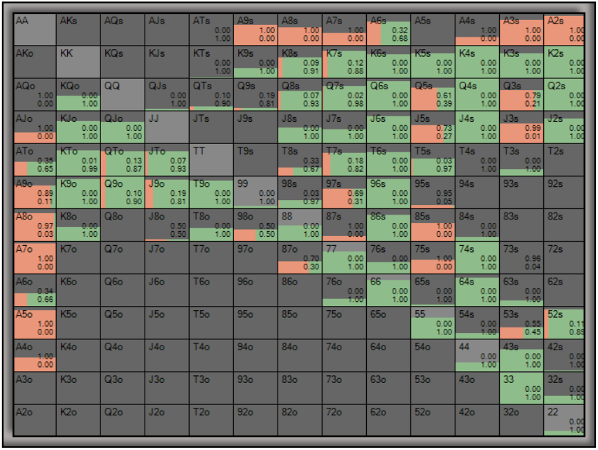 Здесь граница велью проходит где-то между KT и A3 – у BB не будет рук между этими двумя. Из стратегии PIO видно, что всё, что лучше KT, ставит почти в 100% случаев, но лишь до тех пор, пока рука не станет достаточно сильной для чек-рейза.