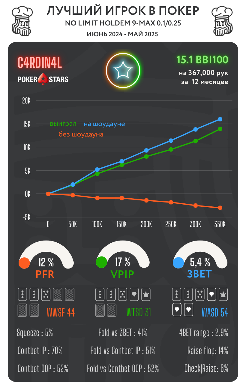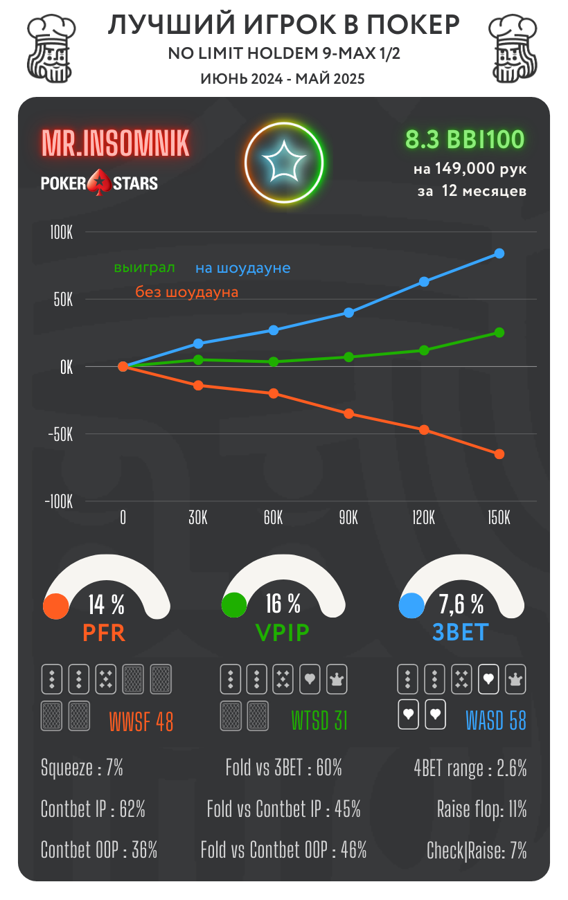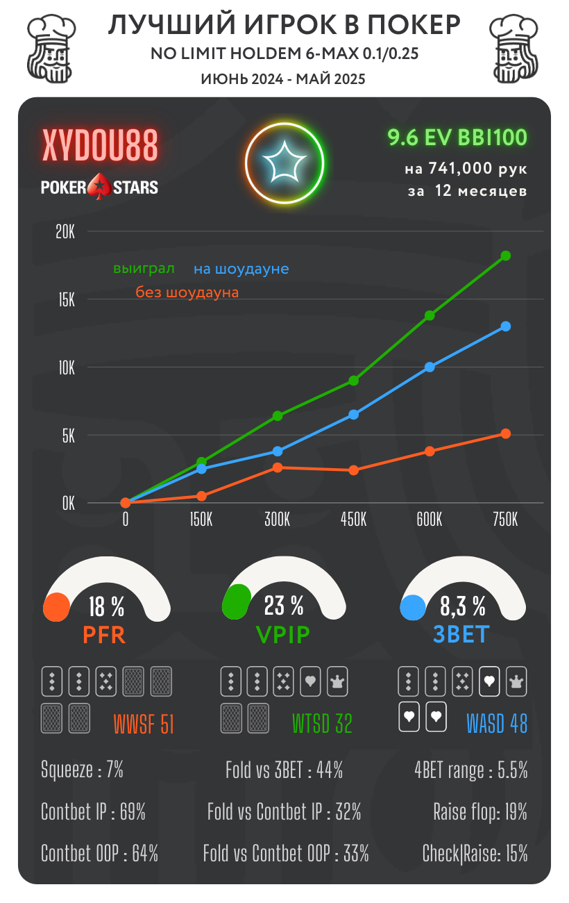 По итогам нынешнего сезона WRD‑рейтинг выглядит довольно свежо: место в нём удалось заполучить игрокам сразу из четырёх покерных сетей - в отличие от прошлых выпусков, где почти полностью доминировали регуляры GGpoker. Особенно непривычно видеть здесь гостя из сети Chico (TigerGaming, BetOnline) eyesONprize. FREDYBULLIT и PayNCry выносят крупные суммы с фулл‑ринг столов в сети Winning. И это ещё без учёта огромного рейкбека рума, который на таких лимитах может доходить до 90 %.