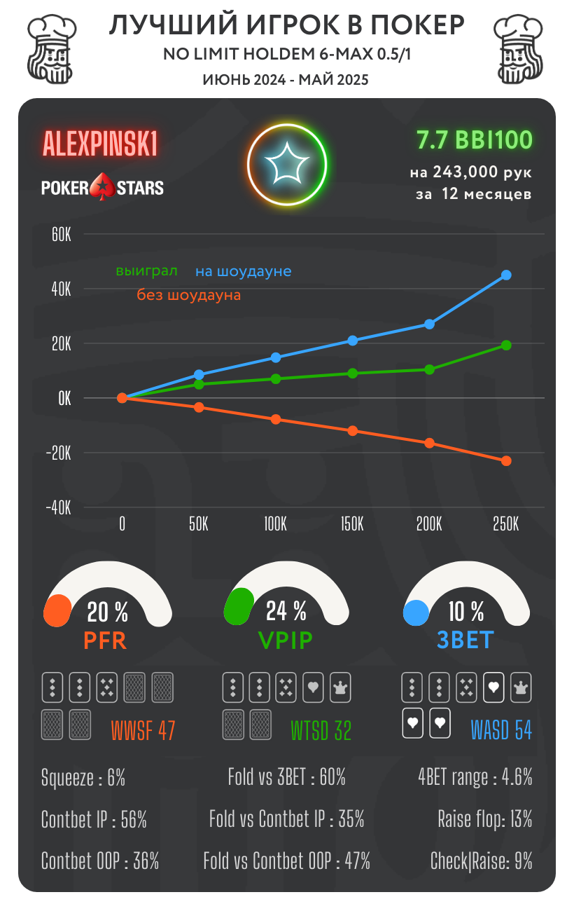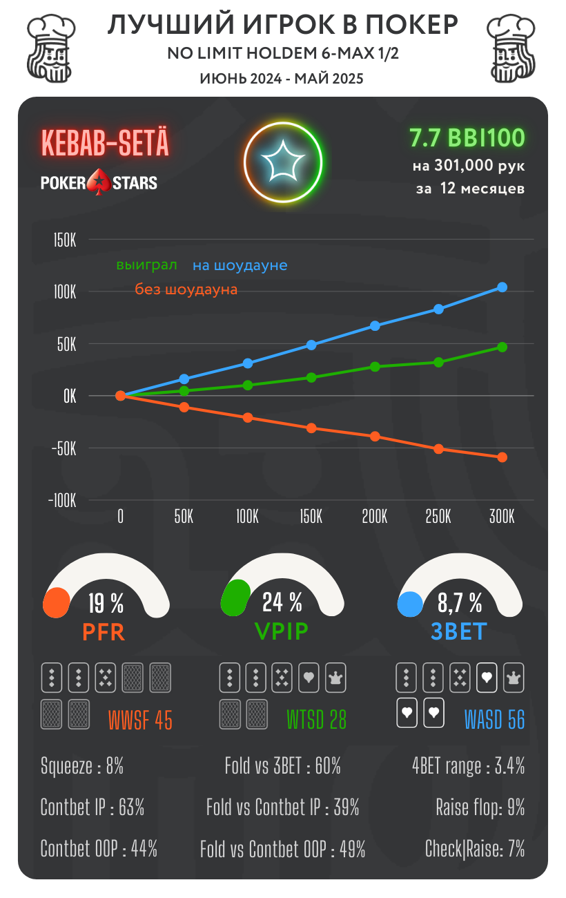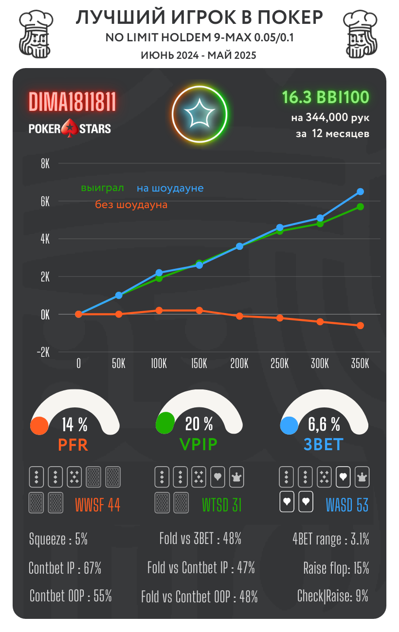 По итогам нынешнего сезона WRD‑рейтинг выглядит довольно свежо: место в нём удалось заполучить игрокам сразу из четырёх покерных сетей - в отличие от прошлых выпусков, где почти полностью доминировали регуляры GGpoker. Особенно непривычно видеть здесь гостя из сети Chico (TigerGaming, BetOnline) eyesONprize. FREDYBULLIT и PayNCry выносят крупные суммы с фулл‑ринг столов в сети Winning. И это ещё без учёта огромного рейкбека рума, который на таких лимитах может доходить до 90 %.